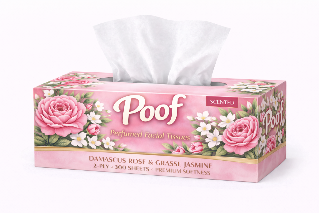 | Poof Perfumed Facial Tissues - Rose & Jasmine | Damascus Rose & Grasse Jasmine scented facial tissues. 2-ply premium softness with 300 sheets. | ![]() |